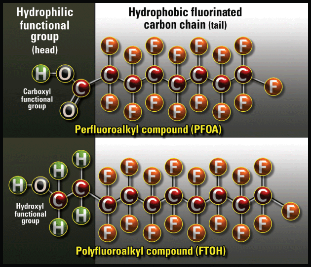 PFAS chemicals are a group of synthetic polymers (long chain molecules) that, once created, have a very long lifespan in the environment. This is why they are often referred to as “forever chemicals” or “persistent pollutants.” They are long-lived due to the fact that the bonds between the carbon and fluorine atoms in the structure are extremely strong. It takes a temperature of 1450°C to break these bonds – temperatures found in nature only in areas of volcanic activity. PFAS chemicals were first created in the 1930’s and there are now thousands of various forms of them that are used in a wide variety of applications including non-stick cookware (including Teflon), water and stain resistant coatings on clothing, carpets and furniture (including Scotchgard), food packaging and firefighting foam (Aqueous film-forming foam, or AFFF). The unique structure of PFAS chemicals makes them ideal for these applications. As seen in the diagram below, the “tail” of the molecule is hydrophobic, meaning it repels water and oil, while the hydrophilic “head” of the molecule interacts with water. This means that PFAS compounds act as surfactants, reducing the surface tension between substances. When introduced into water, PFAS compounds therefore tend to congregate at the surface with tails held up out of the water and heads into the water. This is an important consideration for sampling for PFAS in water, as surface samples should provide the greatest concentration of chemicals and provide a “worst case” scenario for a particular water body.