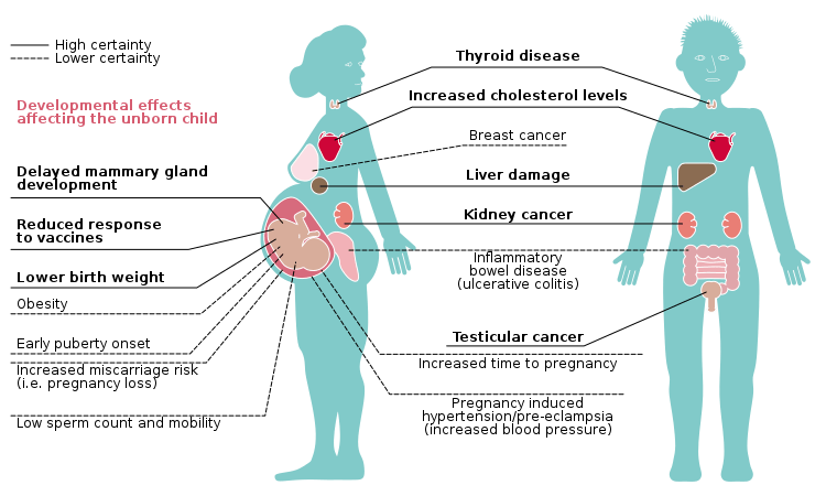 PFAS compounds are ubiquitous in the environment, having been found in living organisms, rivers, lakes, ponds, sediment and, most recently, in the snows of the Matterhorn and other European alpine peaks. They tend to be concentrated in areas of PFAS manufacturing, storage or disposal, or at airports and military air bases where firefighting foam containing AFFF has been used. PFAS compounds tend to bioaccumulate in the living tissues of organisms where they pose a variety of health concerns. Although these myriad potential effects are beyond the scope of this post, the diagram below provides a good summary of possible problems produced in the human body.