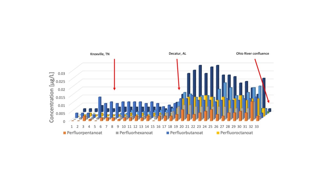 PFAS chemicals have also been found in the Tennessee River watershed and in the Tennessee River itself. I conducted studies of PFAS concentrations in a tributary of the Tennessee River (Boiling Fork Creek/Elk River) in 2025 and along the entire length of the Tennessee River in 2017 as part of the Tenneswim Project. These studies provide an interesting chronicle of PFAS contamination from the rooftop of the Tennessee River watershed through the Tennessee River all the way to its confluence with the Ohio River in Paducah, Kentucky. The tributary sampled was the Boiling Fork Creek, which begins atop the plateau in the town of Sewanee, Tennessee and flows southwest where it enters the 195 -mile long Elk River, which in turn winds its way southwestward to meet the Tennessee River in Alabama. Samples were analyzed for up to 40 different PFAS chemicals in stream water, a lake, a spring, and a stream with treated municipal sewage effluent (see the map with sample locations below). All samples contained some number of PFAS compounds, with select compounds show in the table below. With one exception, the values all along the Boiling Fork and Elk Rivers were below 3.1 ppt and did not show an increase downstream as one might expect. The lone high concentration of 6.8 ppt came from stream water emanating from an artificial turf athletic field. Plastic grass blades from such fields are known to be made with PFAS compounds. The Tennessee River contains similarly low levels of PFAS upstream from Knoxville, but then the levels increase near Knoxville. The Tennessee River PFAS chart shows a large increase in the compounds near Decatur, Alabama where the 3 M manufacturing plant had confessed to previously releasing PFAS into the Tennessee River. The levels remain elevated all the way downstream to Paducah, Kentucky.