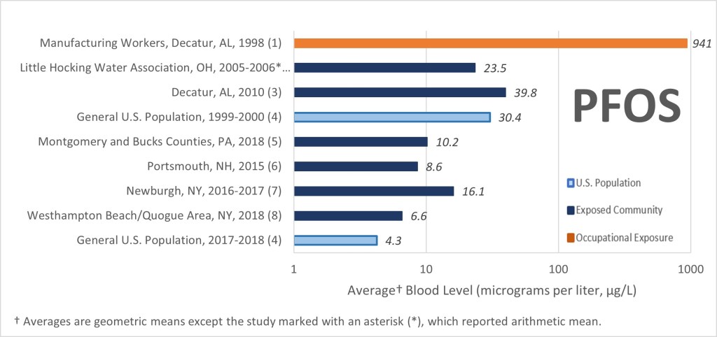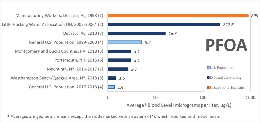 PFAS compounds are considered so toxic that even extremely small quantities in the environment are of concern. This is why they are measured in parts per trillion (ppt, or nanograms per liter, ng/l). One part per trillion is about the same as one drop of water in 20 olympic-size swimming pools. Studies have shown that most Americans have some amount of PFAS in their blood. The diagrams below show trends in blood contamination by two types of PFAS compounds, PFOA and PFOS, for three groups of people in the US over a period of 20 years. These groups include workers in PFAS manufacturing facilities, communities with PFAS-contaminated drinking water, and the general population. The reduction in concentrations over time is due to the gradual phase-out of these two particular chemicals since the early 2000’s. Of course, other PFAS compounds still in use likely don’t follow this trend.