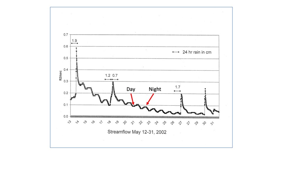 The Y-axis (vertical) shows stream flow in ft3/sec at the point where the stream leaves the watershed, but this can simply be viewed as stream level, where moving up on the axis indicates a higher level. The X-axis (horizontal) shows time in terms of days during May of 2002. So, what does this graph show us? The most obvious trend (reading from left to right) over the 20 days is the overall gradual drop in stream level. This is in spite of the four rain events which show up as brief, steep rises in stream level. The amount of precipitation in cm for each event is indicated by the bars above the spikes. One of the most interesting trends is shown by the daily, small bumps on the hydrograph. What would make the stream level rise and fall on such a daily (or diurnal) basis? This is the work of the deciduous forest which completely covers the watershed. During the growing season all plants from grasses and bushes near the forest floor right up to the tallest trees in the upper canopy take water up through their roots so that they can carry on the process of photosynthesis, whereby new biomass is created. This uptake of water by the forest is a daytime process, resulting in a temporary drop in the water table and in the amount of basefow entering into the stream. A kind of “inhalation” of water by the forest. On the hydrograph this shows up as one of the daily depressions (labeled “Day”) when the stream level is lowered. When the plants stop pumping water up during the night, the water table and baseflow rebound, leading to a “bump” on the hydrograph (labeled “Night”), indicating a rise in stream level. This diurnal spectacle represents the collective “breathing” of the forest. Where does all the water taken up by plants go? The vast majority leaves the plants during the sunlight hours as water vapor from small pores (stomata) on the undersides of leaves. This process is called transpiration.