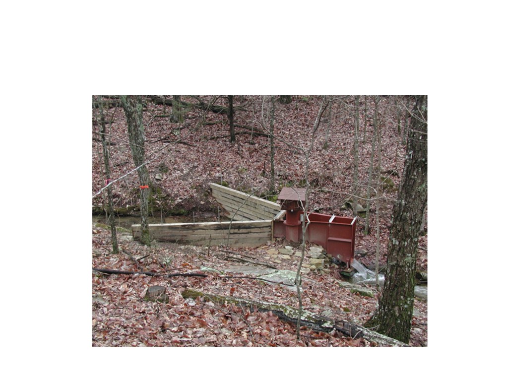 Such an arrangement has been placed on the completely forested, 50-acre Split Creek watershed atop the Cumberland Plateau in Sewanee, Tennessee. Here a flume has been installed to collect all the stream water before it leaves the watershed on the edge of the plateau. A stilling well is attached to this flume and records water levels several times per minute.