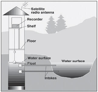 Baseflow enters the stream long after a rain event has taken place, but the amount of water added to the stream from the ground will diminish over time if not resupplied by rainfall. This is seen at the surface as a drop in stream level. How do we study and measure changing stream levels due to changes in baseflow? Most hydrologists pick a spot along a stream where the cross sectional area of the stream can be measured. Then they employ an electronic water level measuring device that is installed in a stilling well on the stream bank. The stilling well is connected to the stream and therefore shows the actual stream level at any time in a calm (“stilled”) environment.