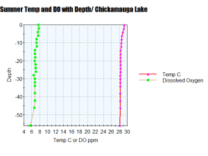 It is interesting to compare Plateau lakes to other lakes in the region. For example, is summer stratification similar in the large lakes of the Tennessee River? Below is a graph showing August values of temperature and DO near the dam in Chickamauga Lake near Chattanooga, Tennessee.